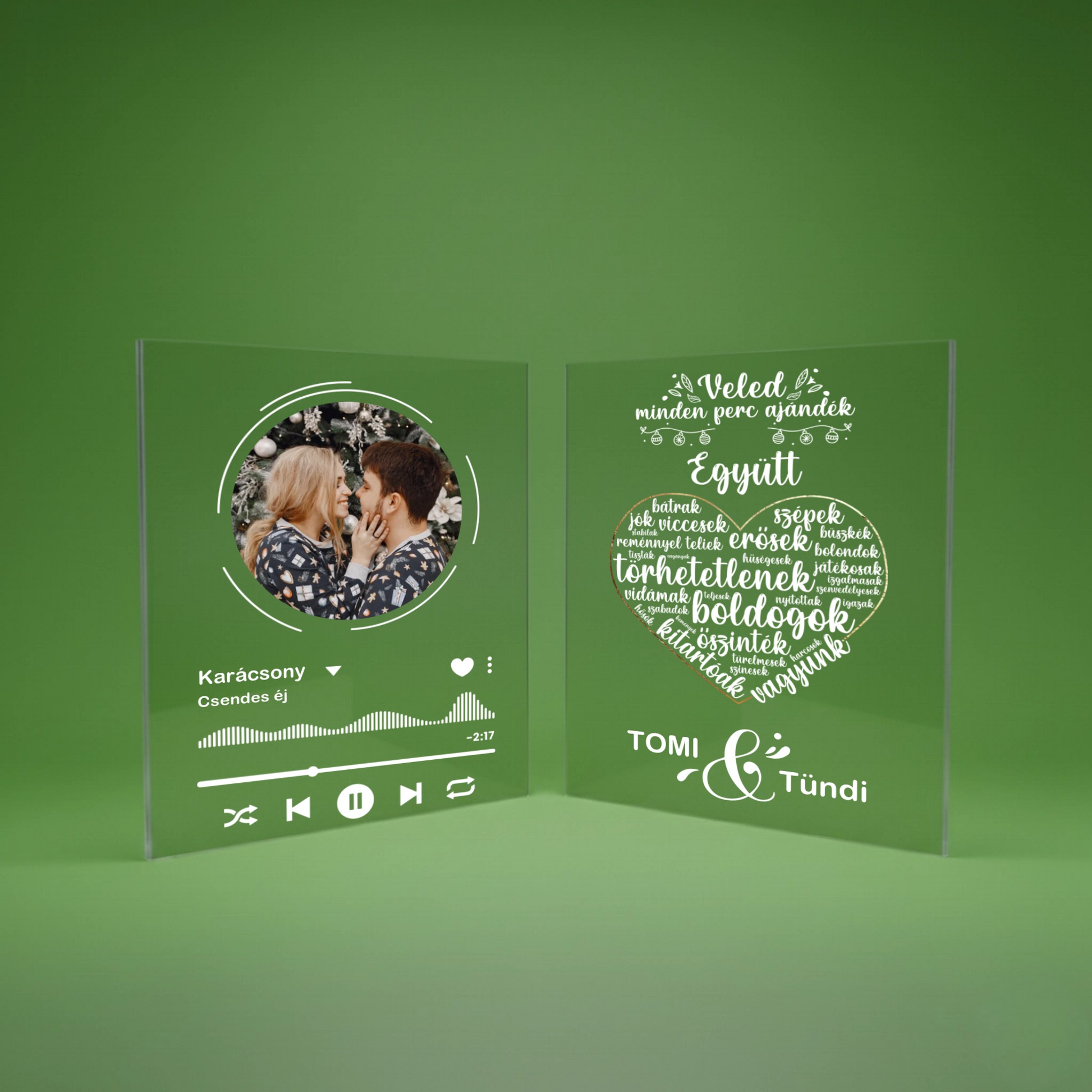 Személyre szabható: saját fotó + nevek, dátum, egyedi üzenet, kedvenc dal
