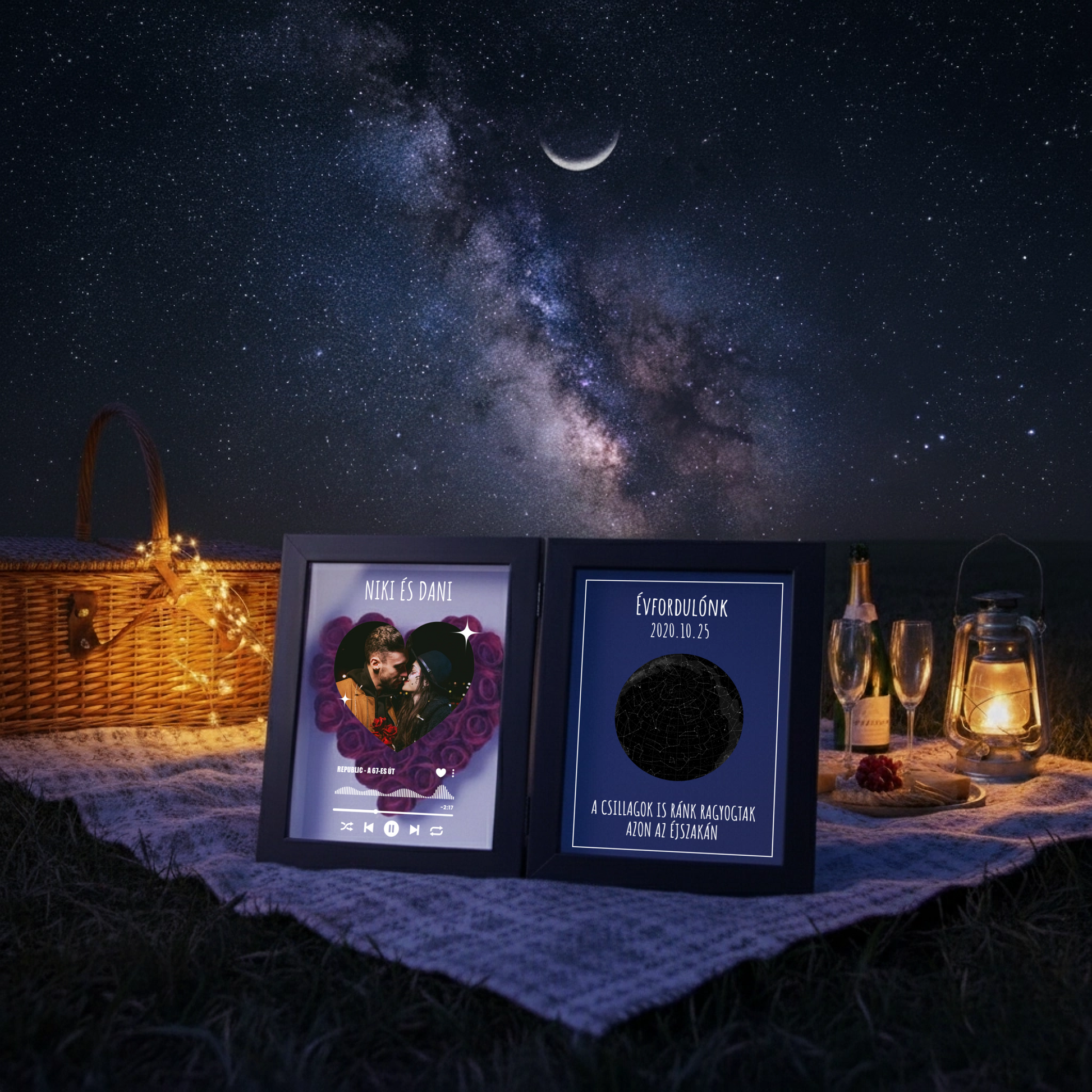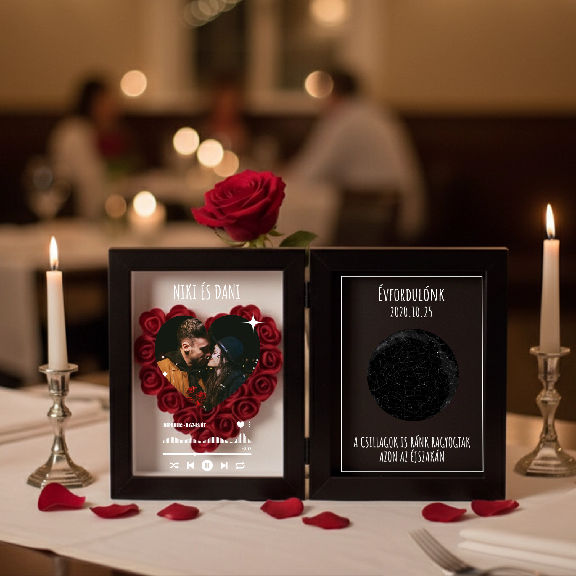 Személyre szabható: saját fotó + nevek, dátum, egyedi üzenet, kedvenc dal
