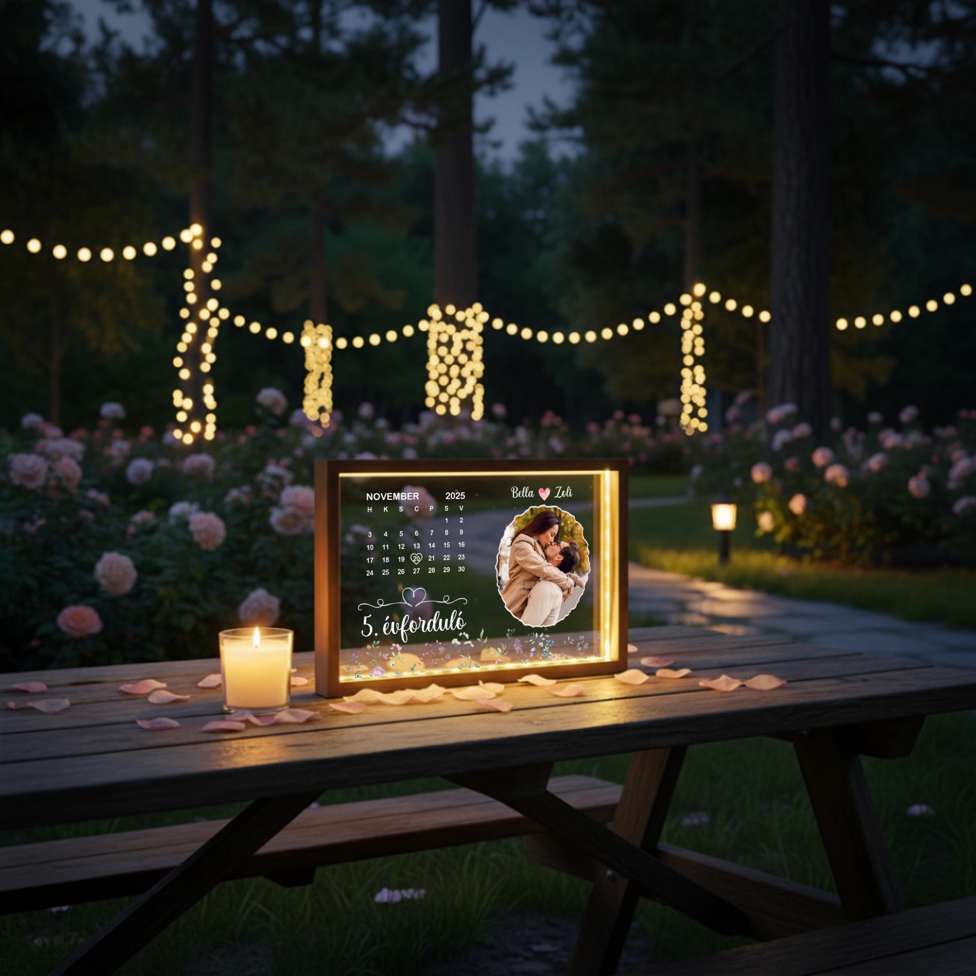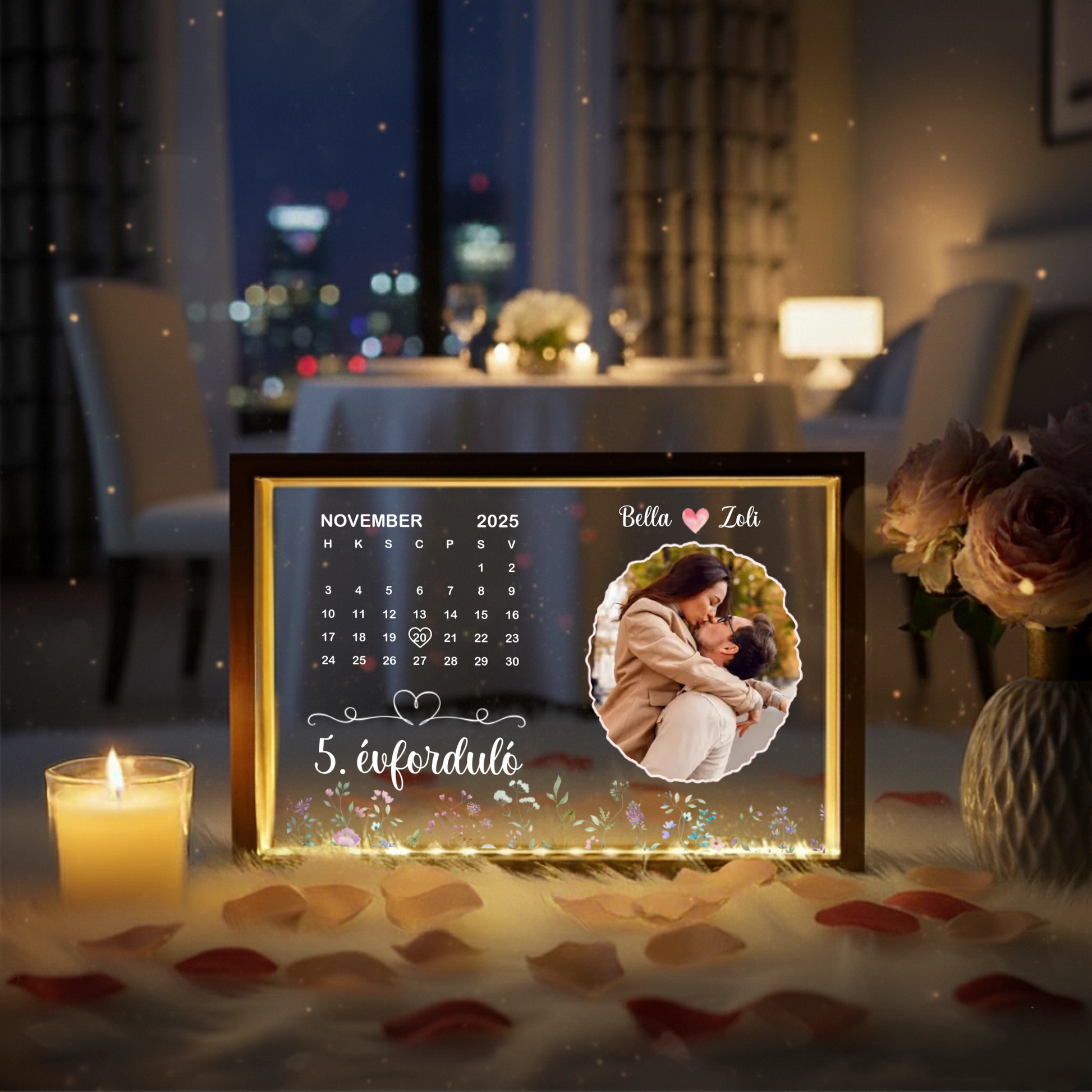 Ajándékozz örök emléket! Ez a személyre szabható világító képkeret egyedi fotóval, nevekkel és dátummal készül – egy különleges pillanat megvilágított formában.