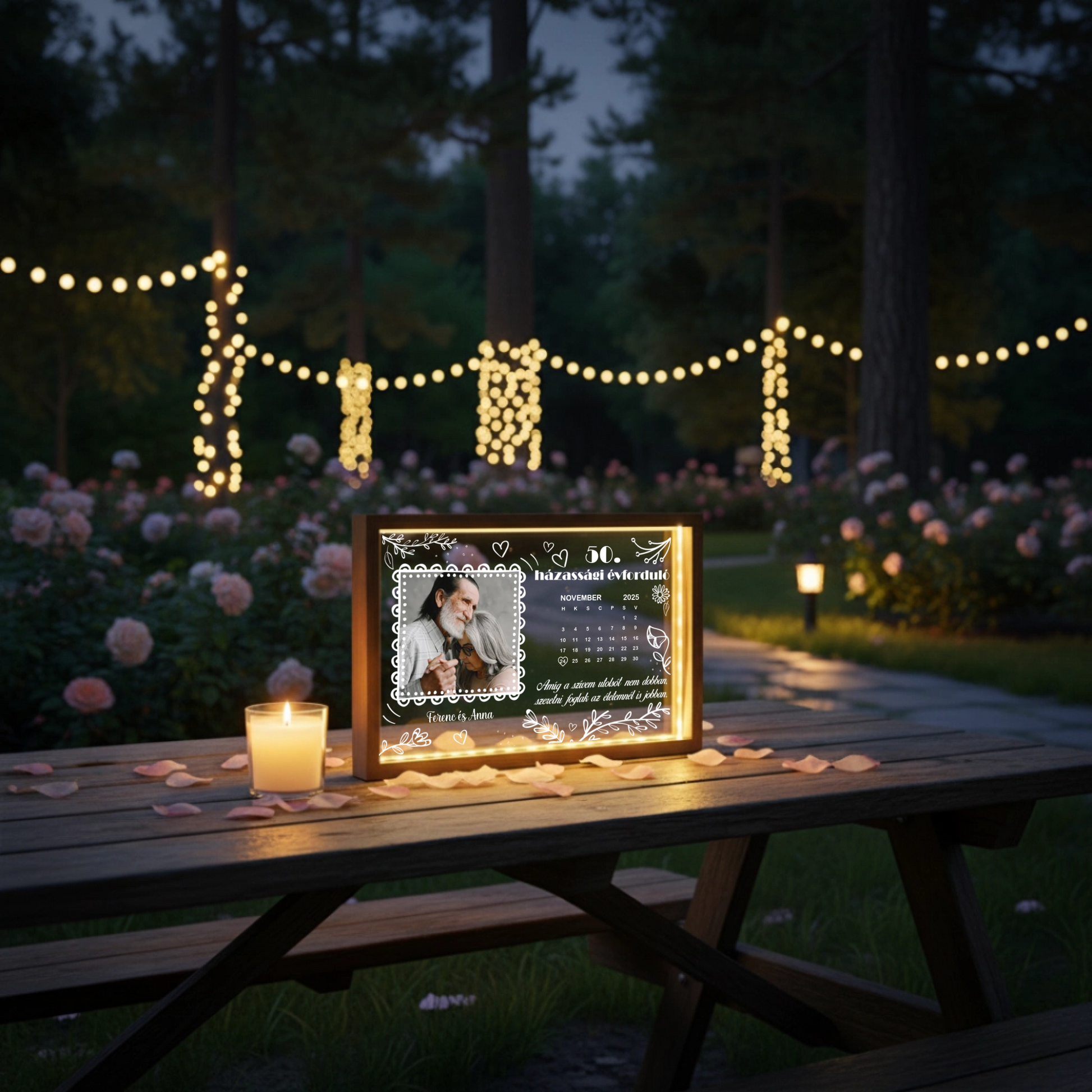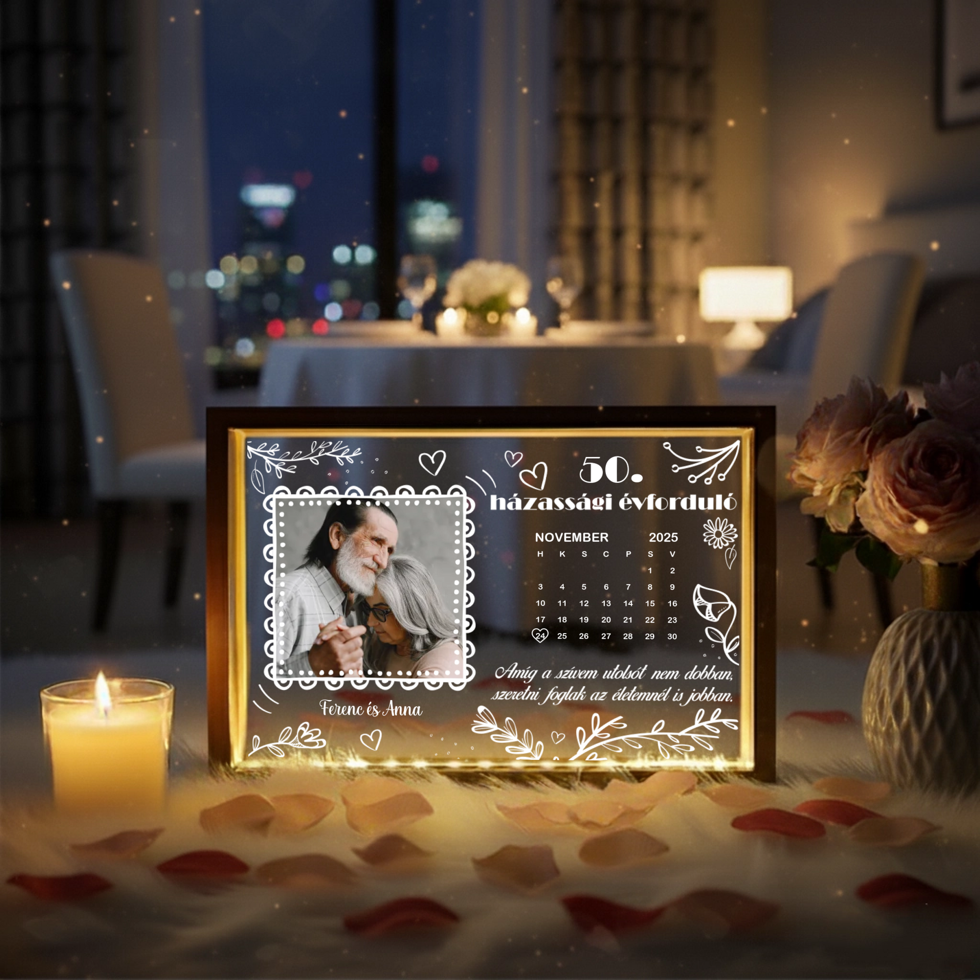 Ajándékozz örök emléket! Ez a személyre szabható világító képkeret egyedi fotóval, nevekkel és dátummal készül – egy különleges pillanat megvilágított formában.