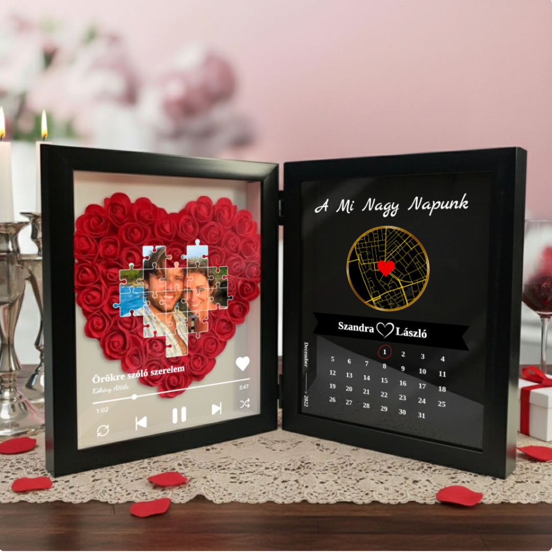 ✅ Személyre szabható: saját fotó + nevek, dátum, egyedi üzenet, kedvenc dal